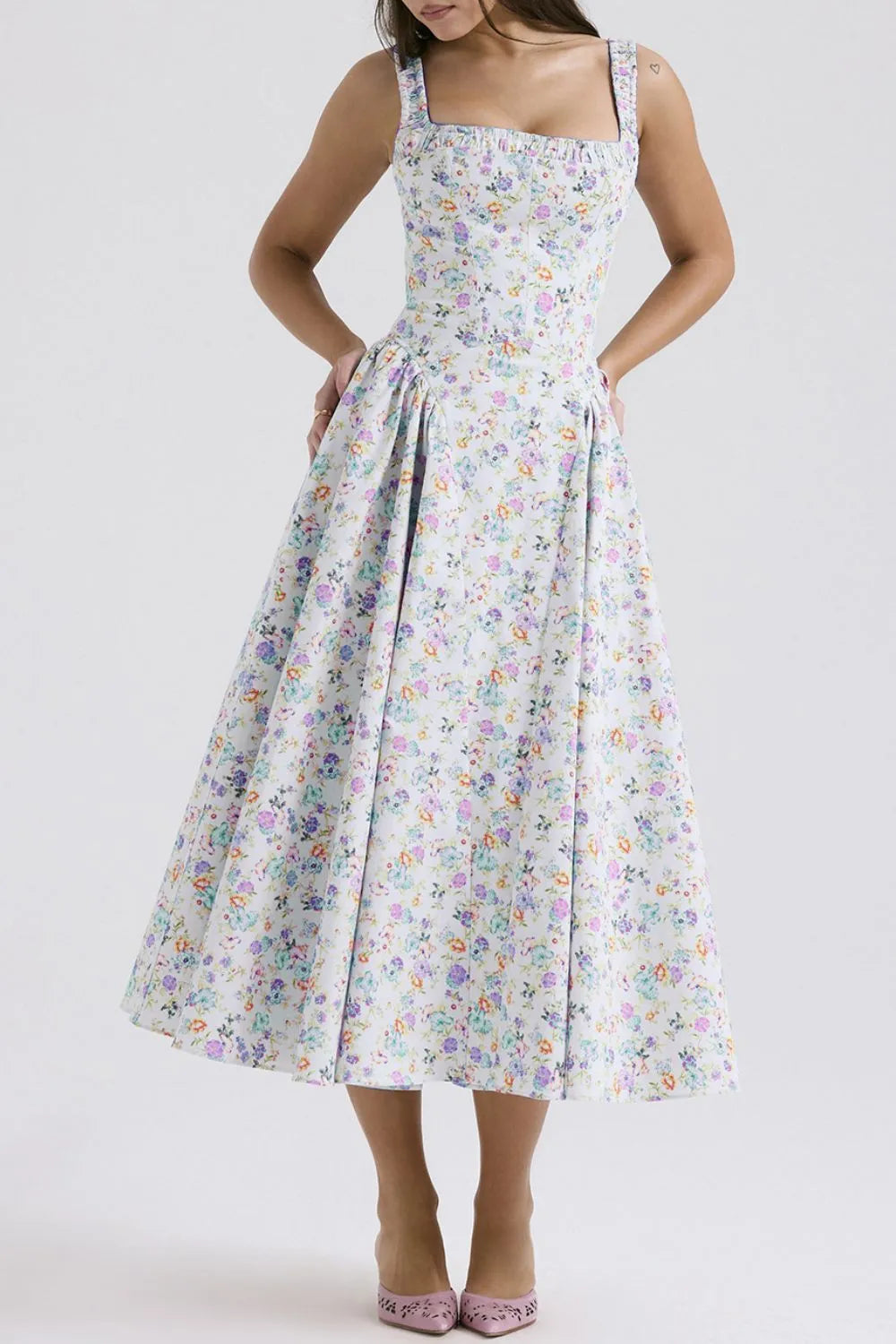 Velste Floral Square Neck Wide Strap Midi Dress