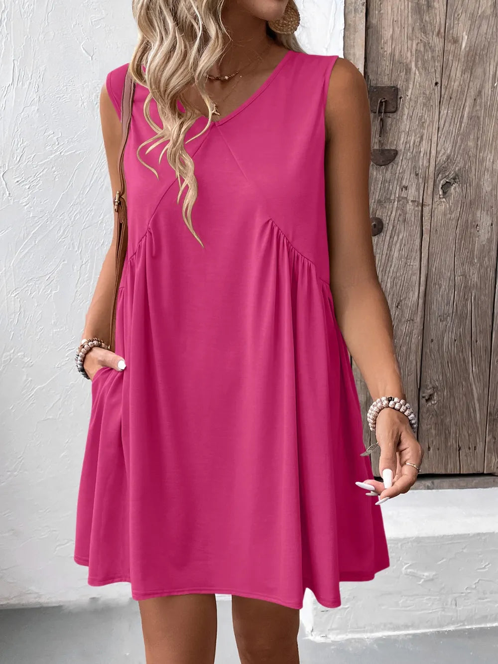 Velste Ivy Lane Ruched V-Neck Sleeveless Mini Dress