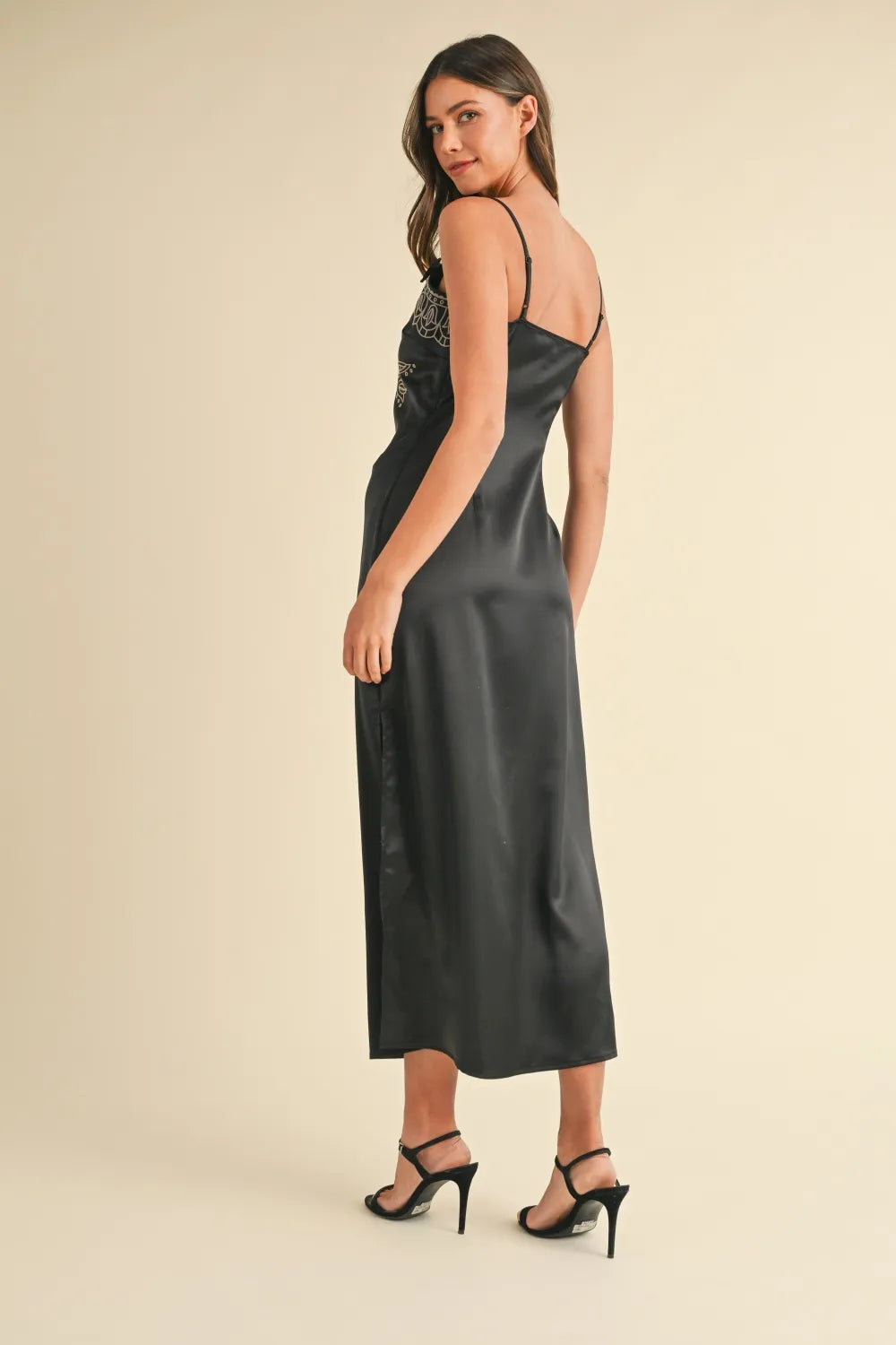 Velste Mable Embroidered Cami Satin Midi Slit Dress