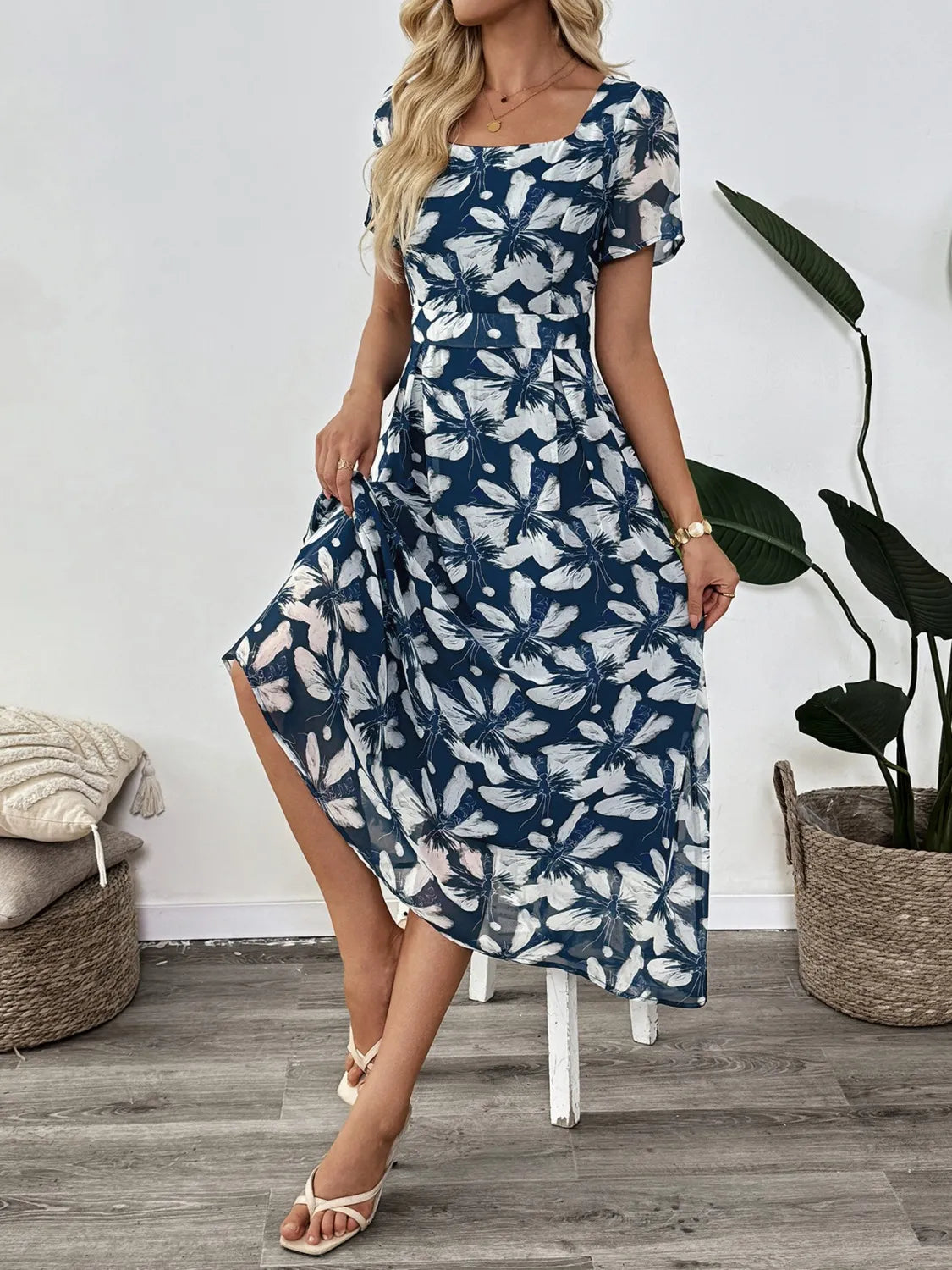 Printed Square Neck Midi Dress