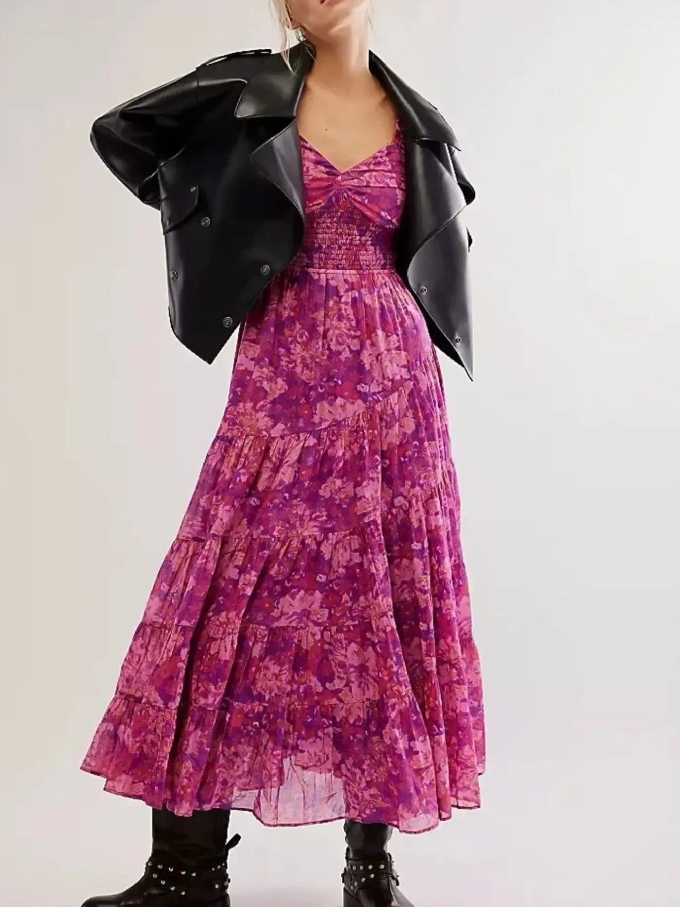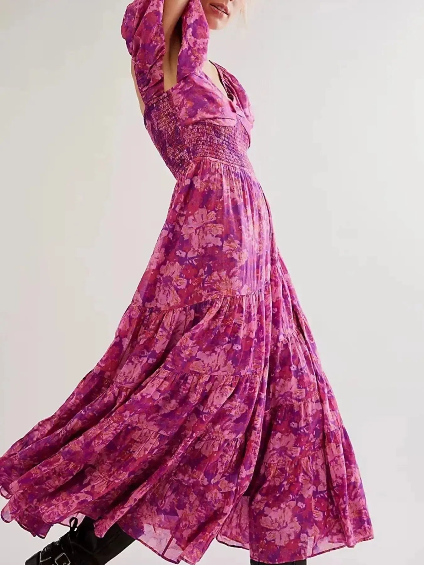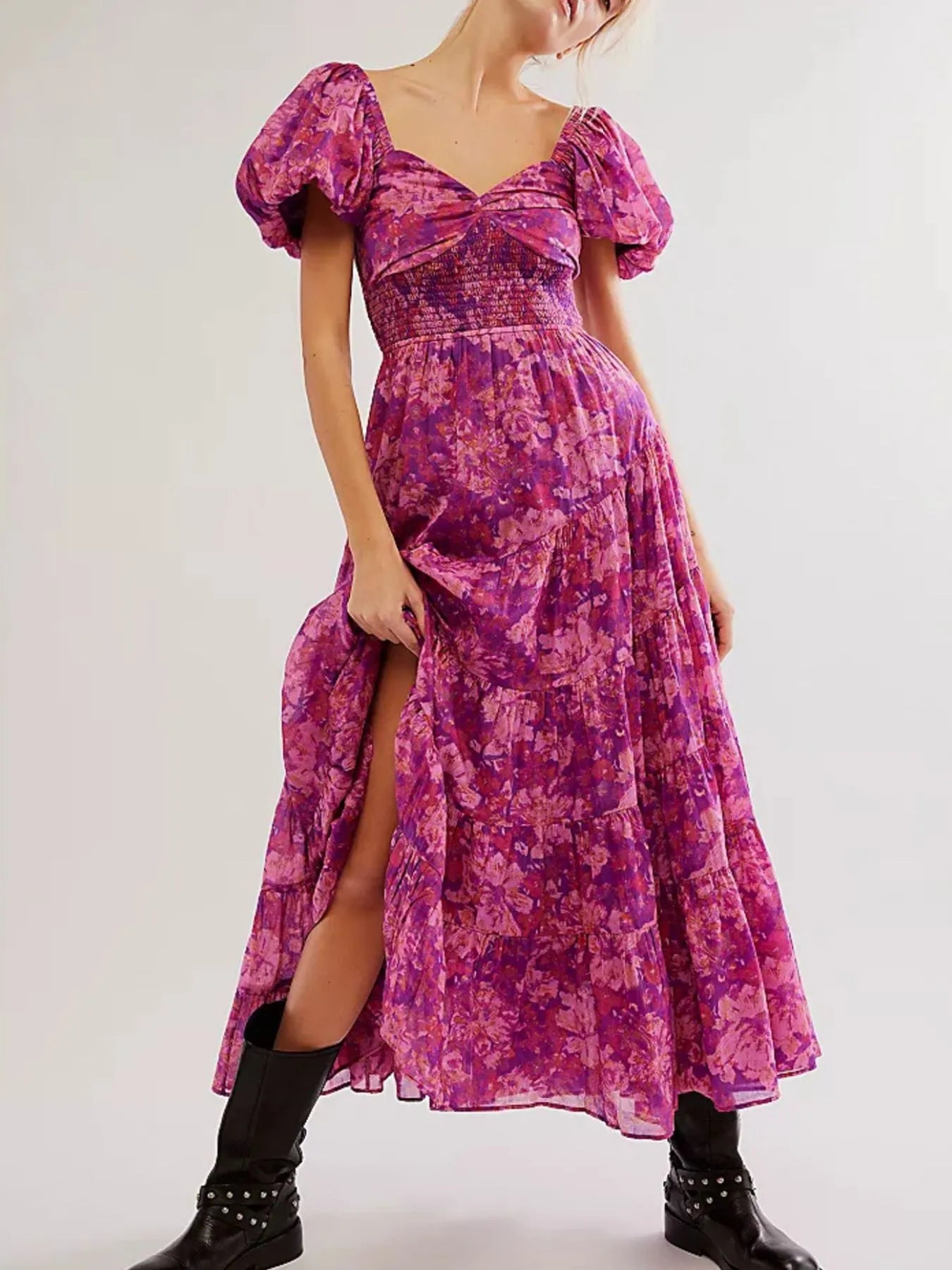 Printed Sweetheart Neck Puff Sleeve Maxi Dress