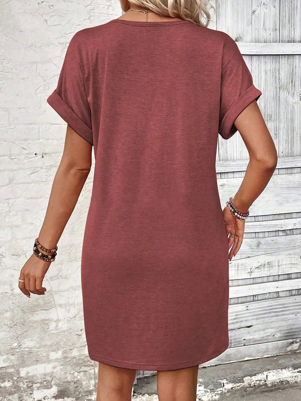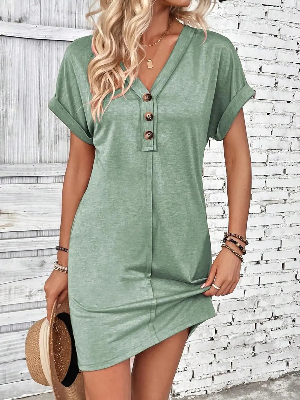 Quarter Button V-Neck Short Sleeve Dress