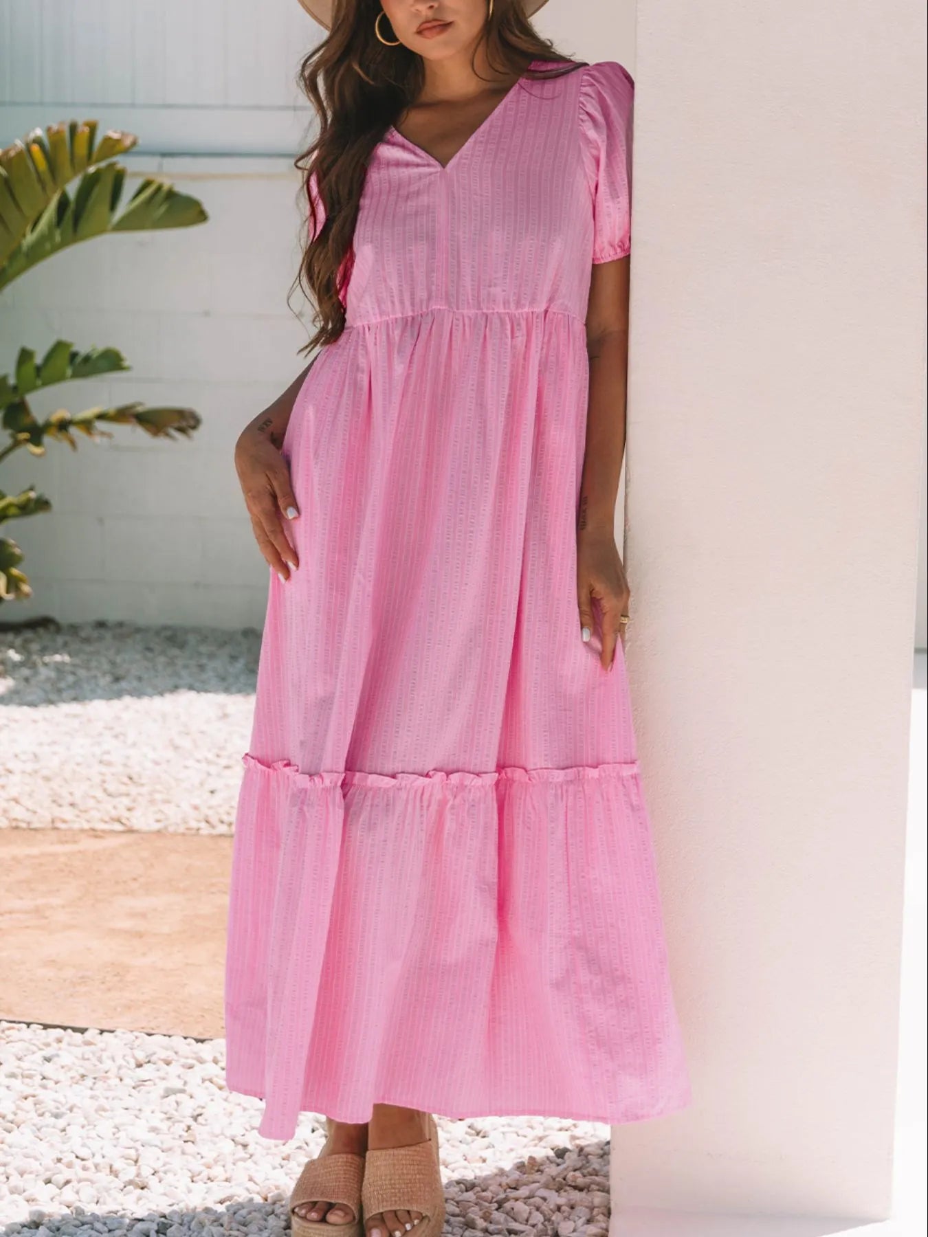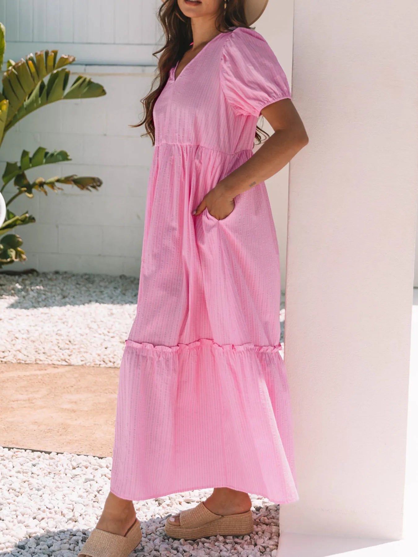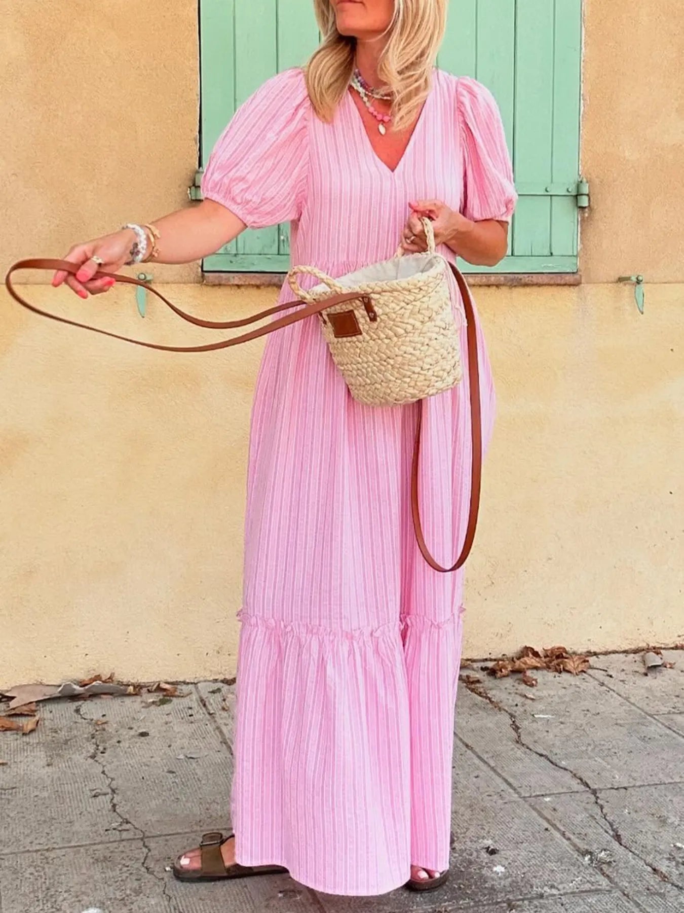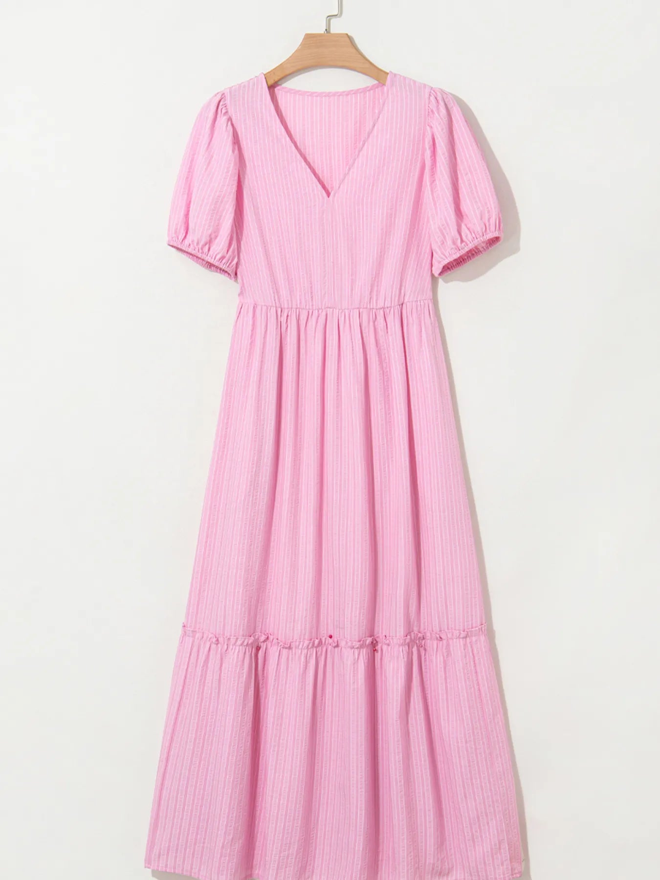 Velste Striped Puff Sleeve V-Neck Maxi Dress