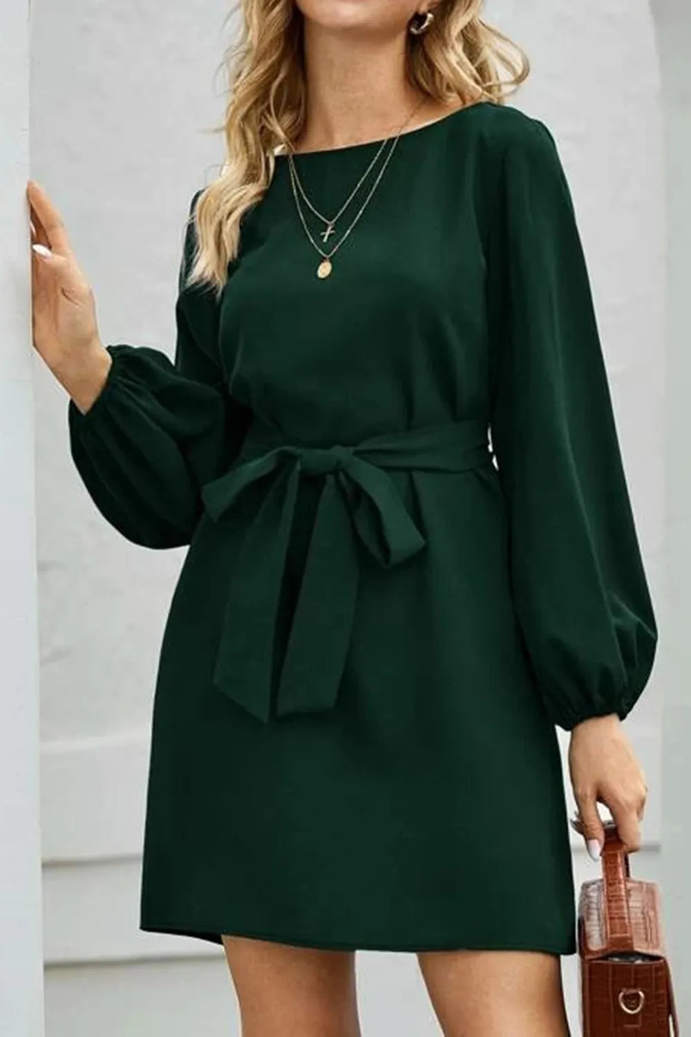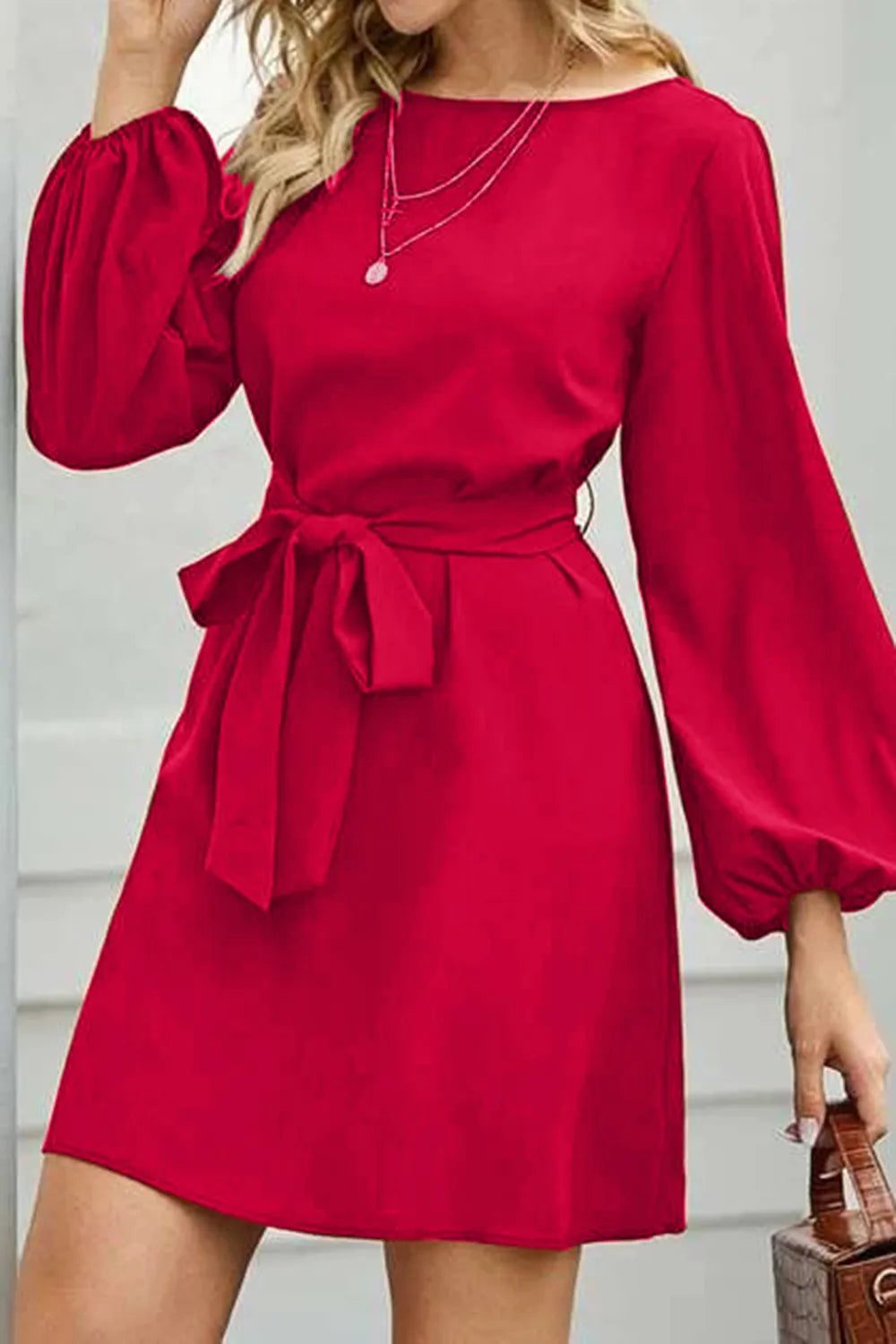 Velste Tied Boat Neck Balloon Sleeve Mini Dress