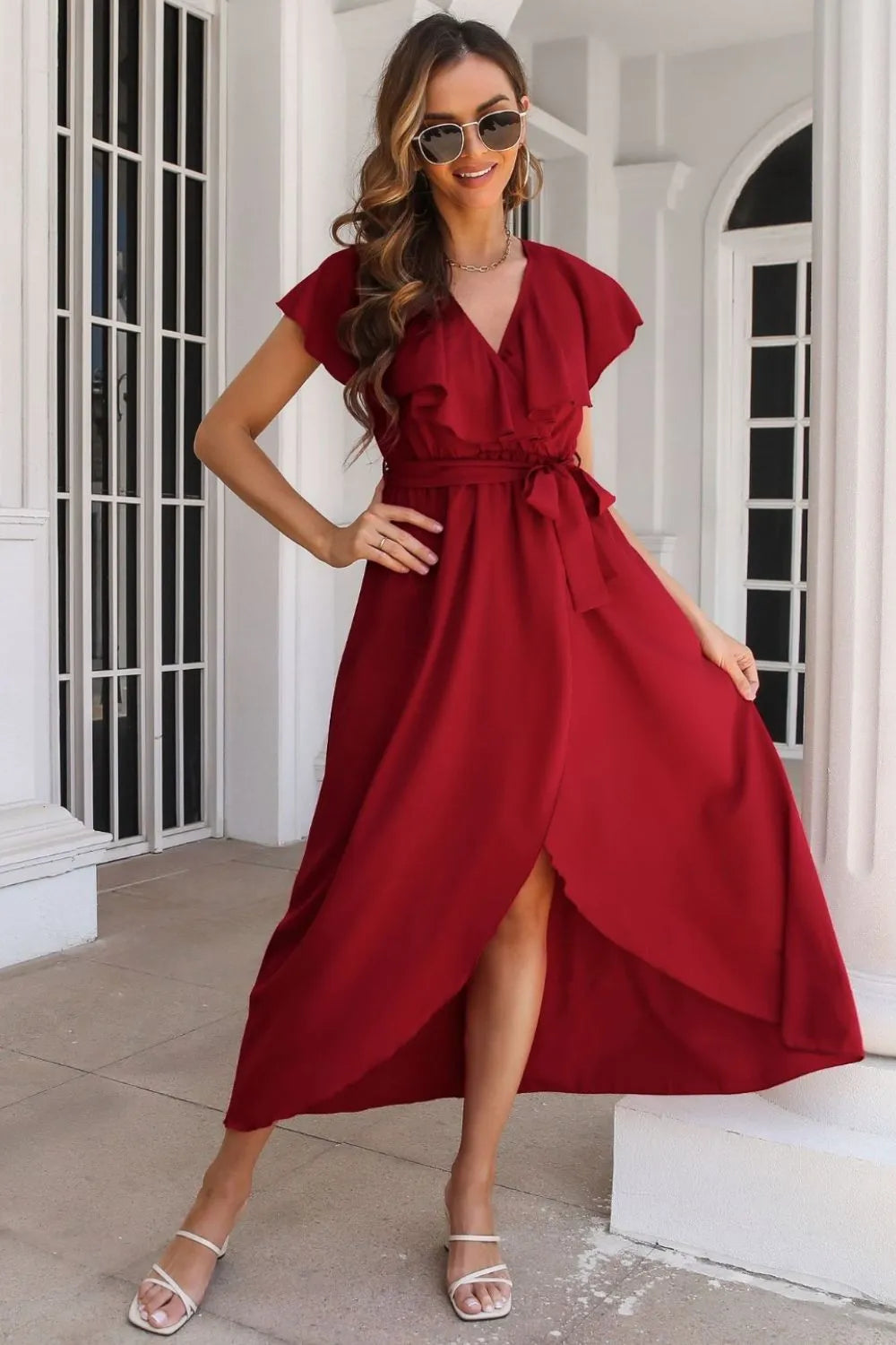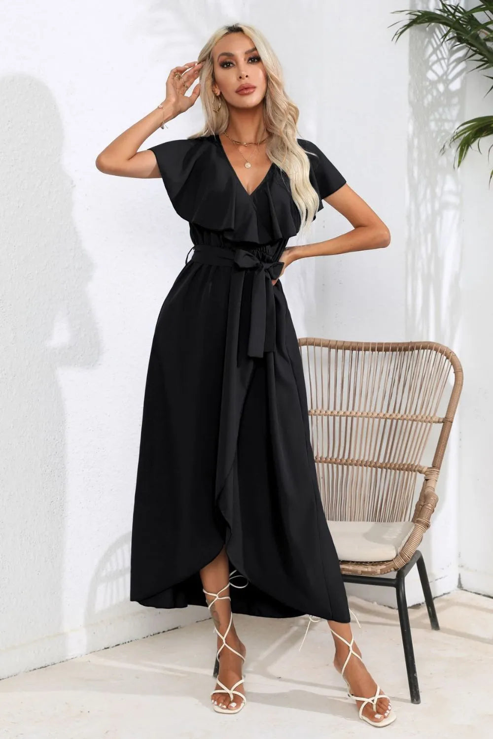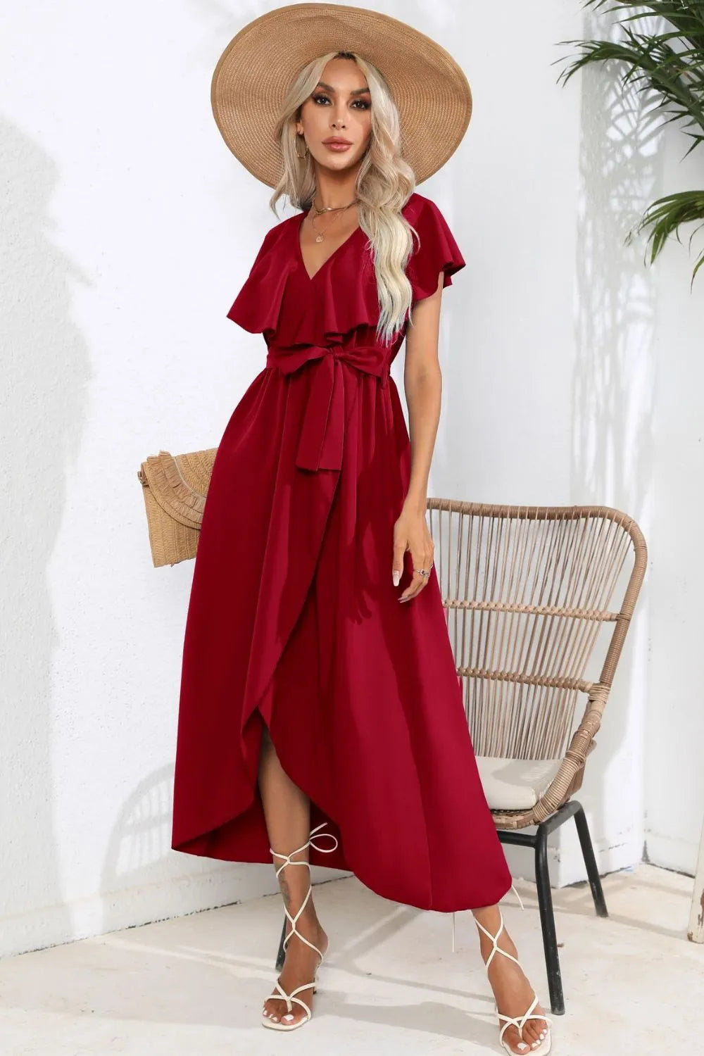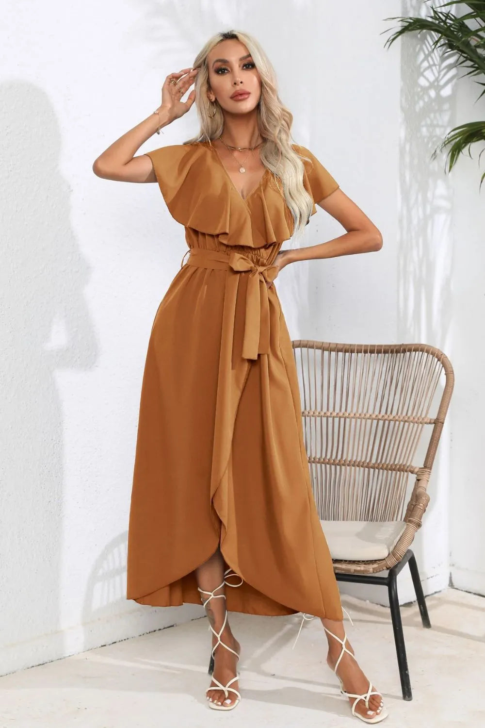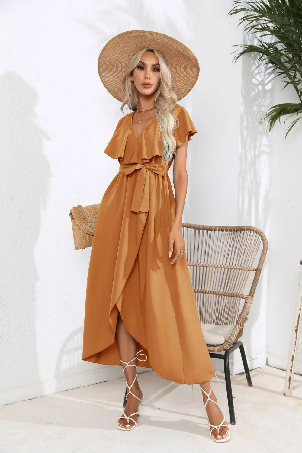 Velste Tied Front Ruffled Short Sleeve Midi Dress