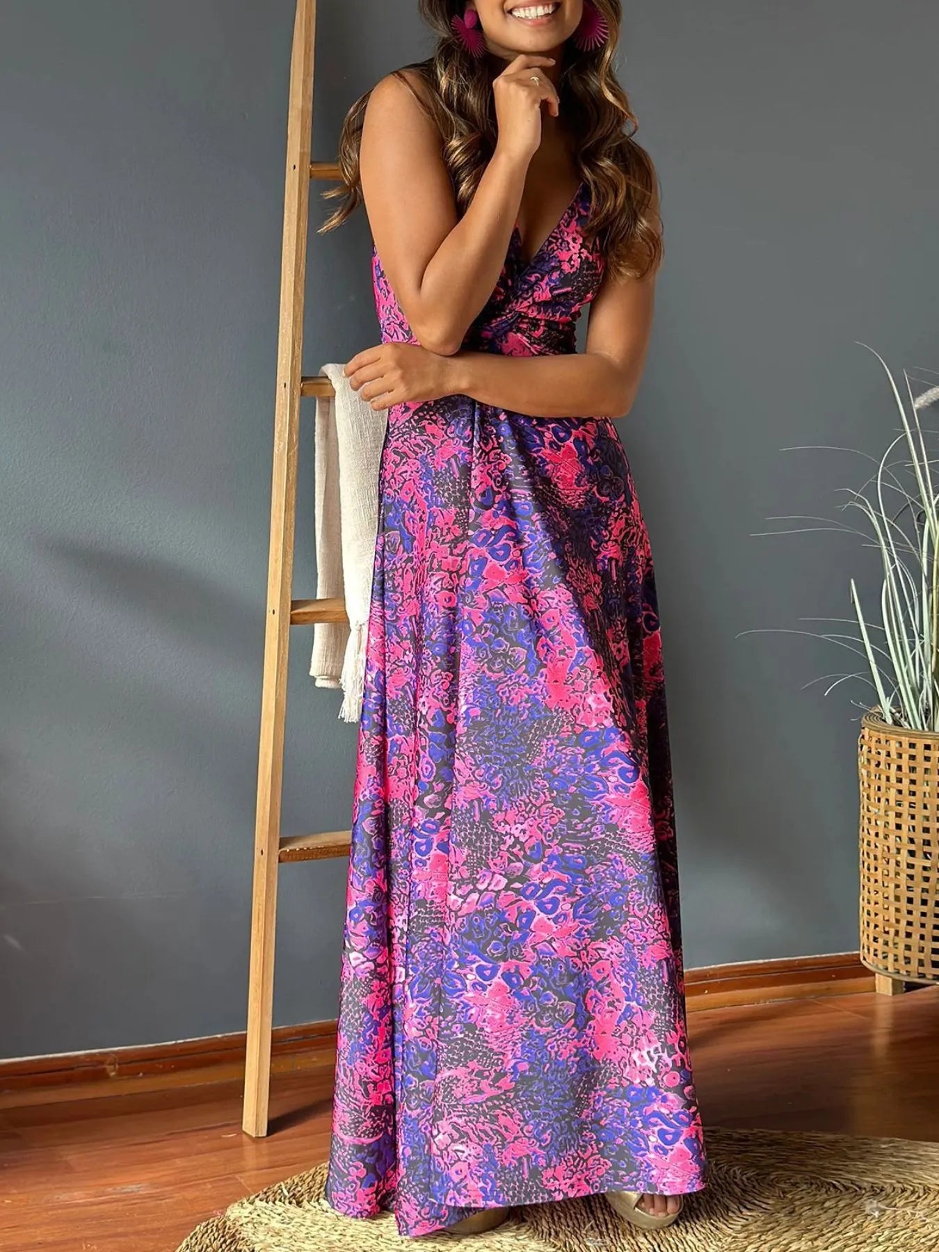 Tropical Print V-Neck Maxi Dress