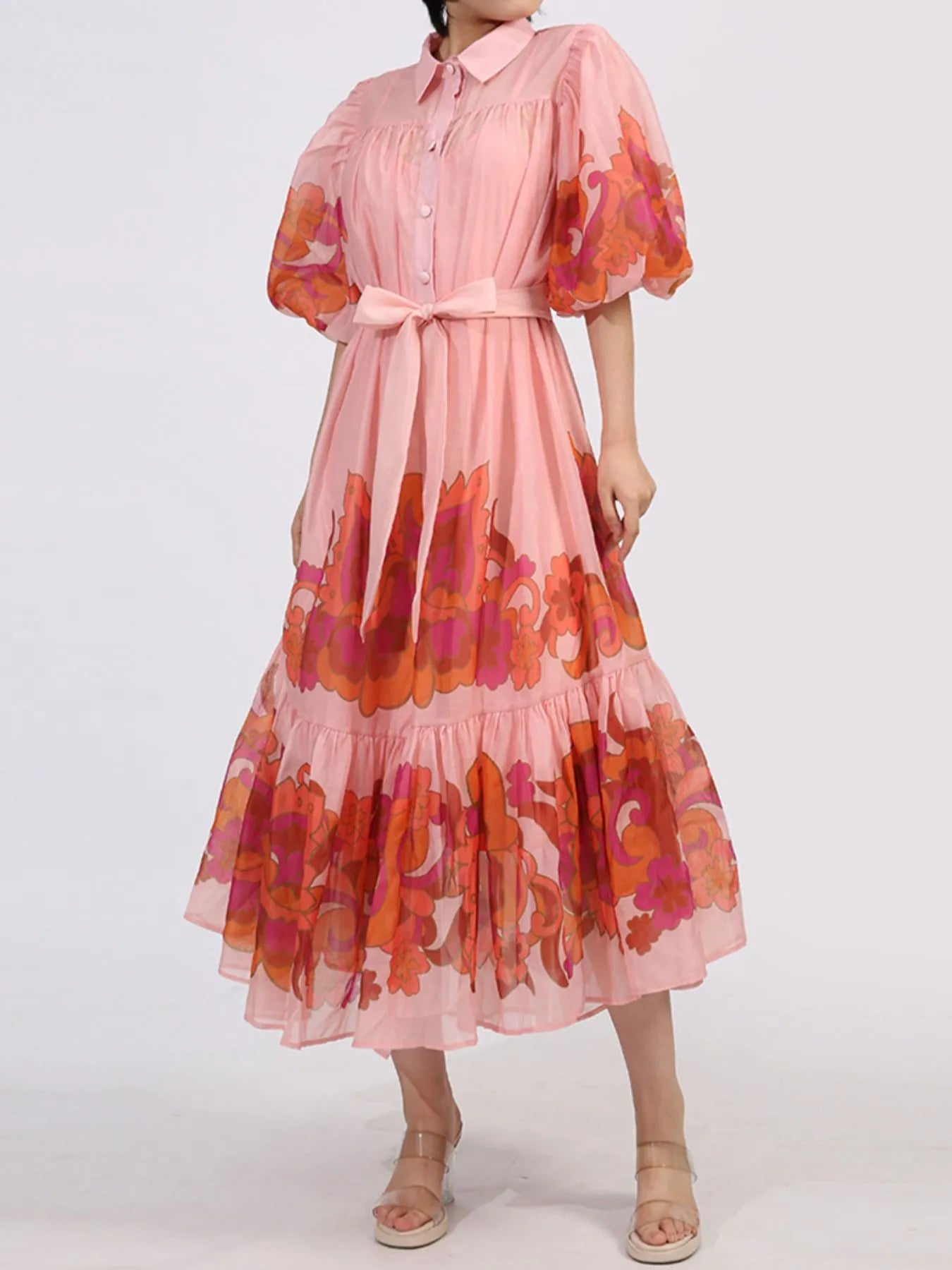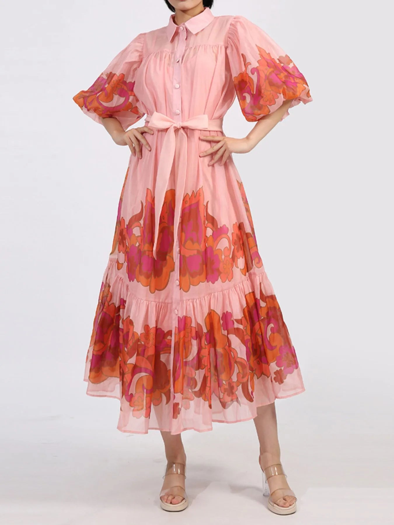 Velste Button Front Puff Sleeve Dress