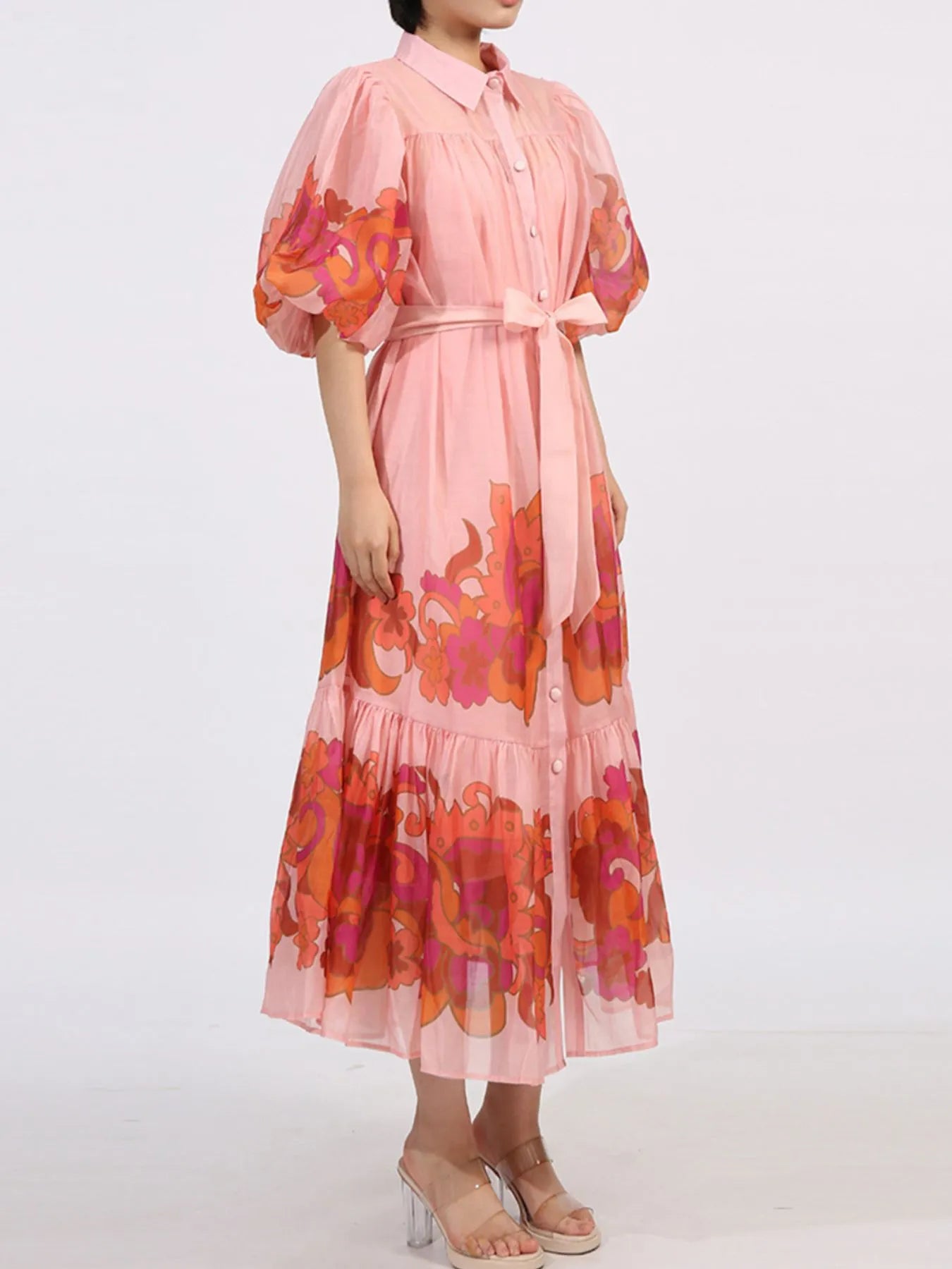 Button Front Puff Sleeve Dress