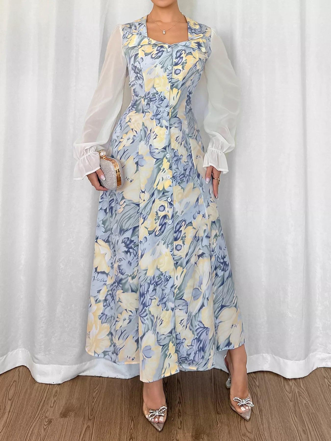 Velste Floral Print Sheer Flounce Sleeves Dress