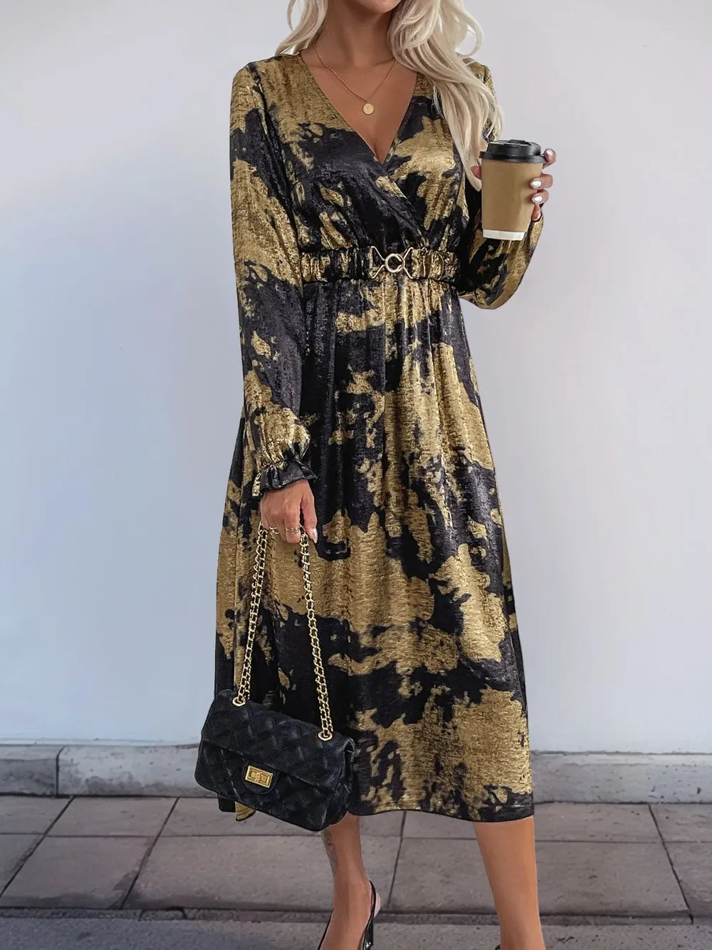 Velste Perfee Printed Surplice Long Sleeve Midi Dress