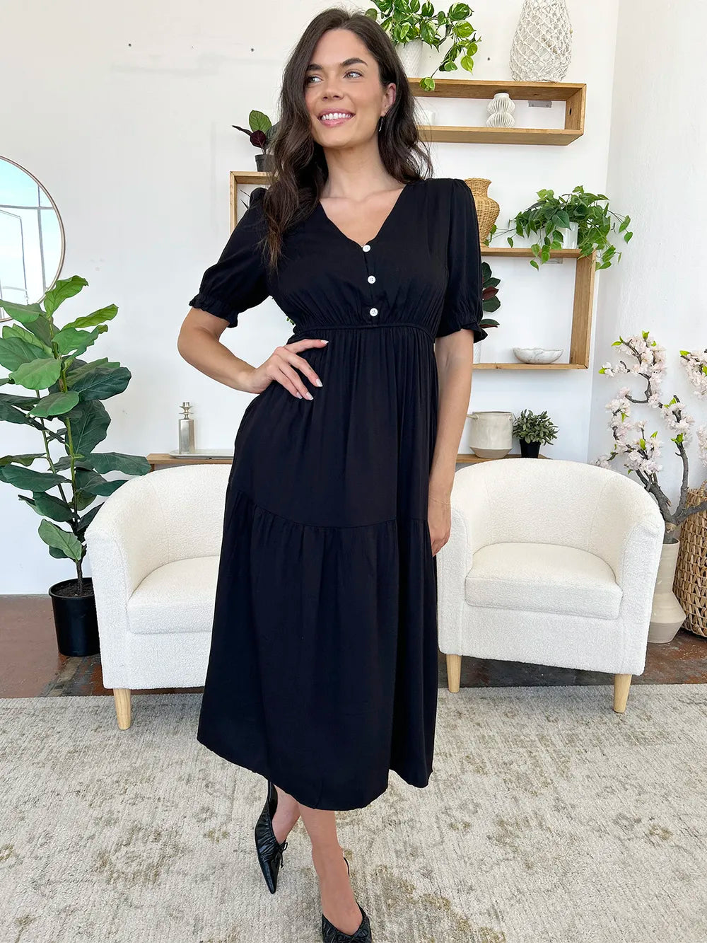Velste Perfee Ruched V-Neck Half Sleeve Midi Dress