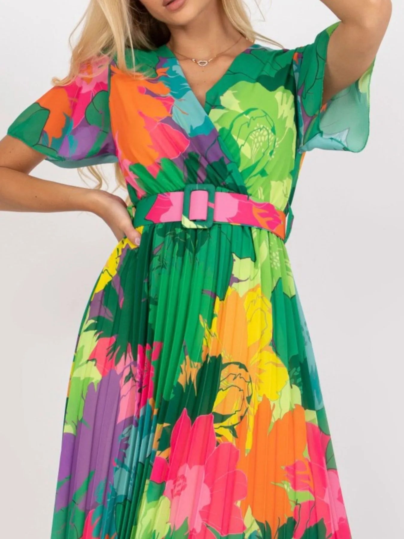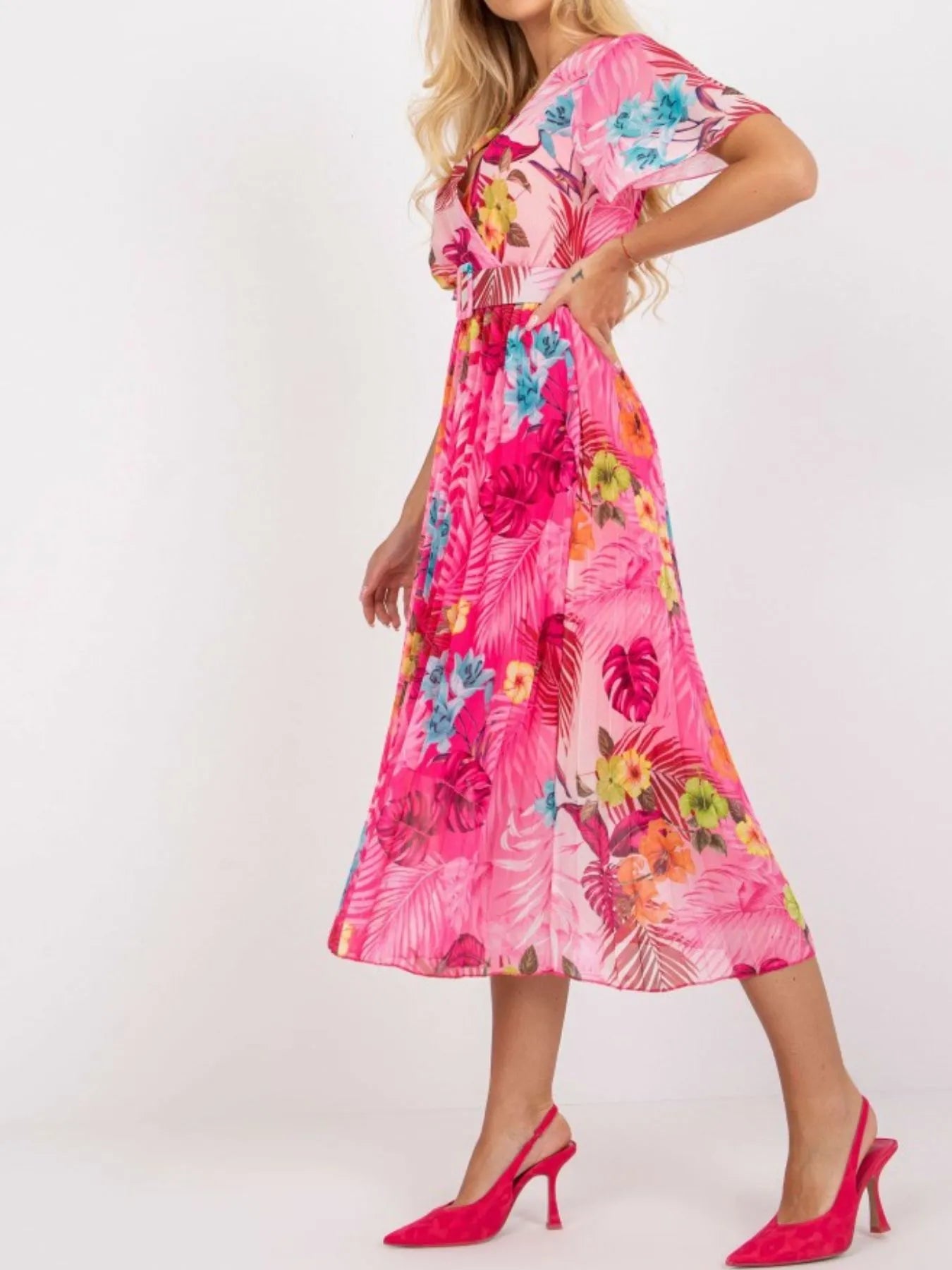 Printed Pleated Midi Wrap Dress with Belt