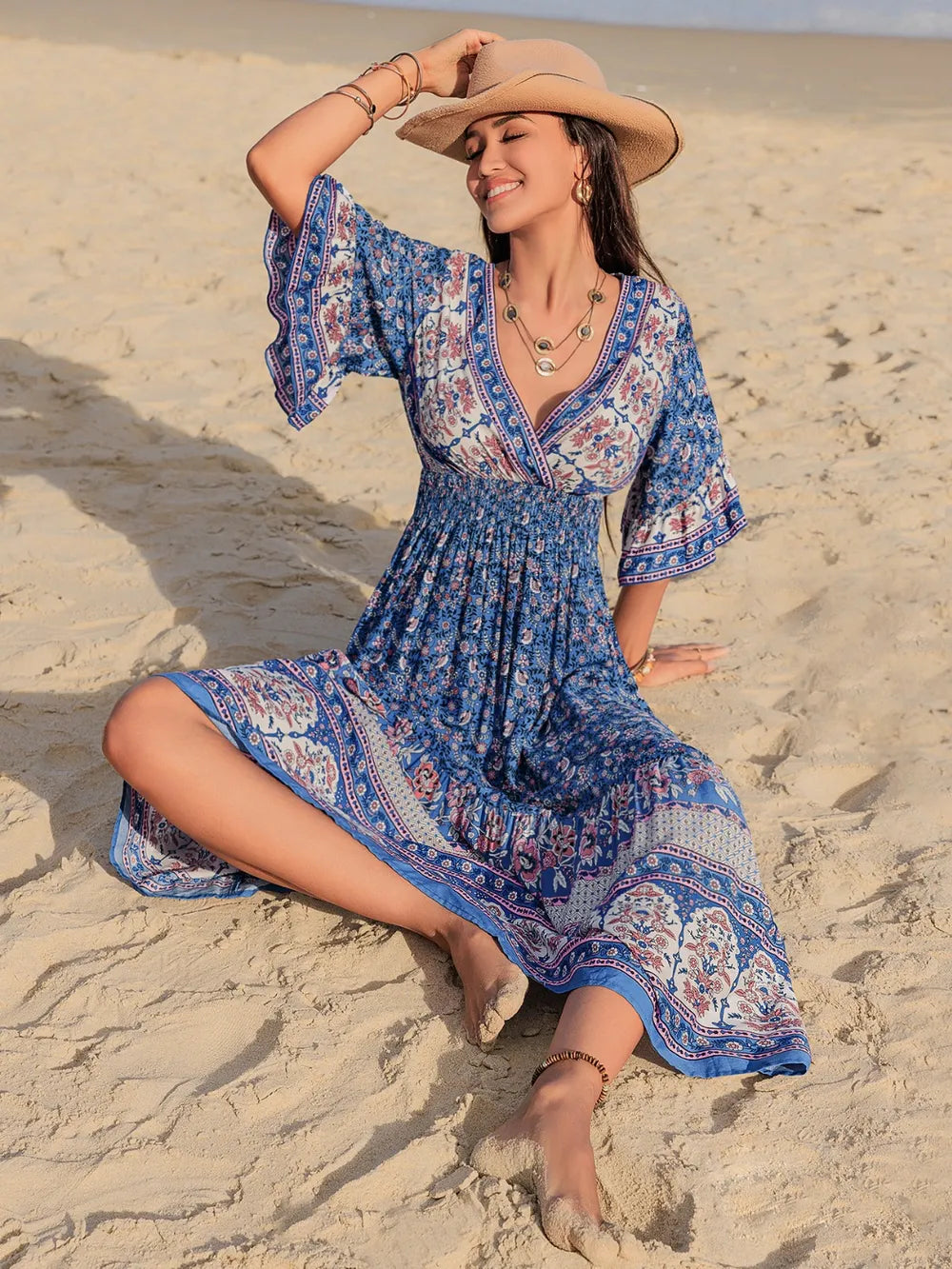 Velste Ruched Printed Flounce Sleeve Midi Dress
