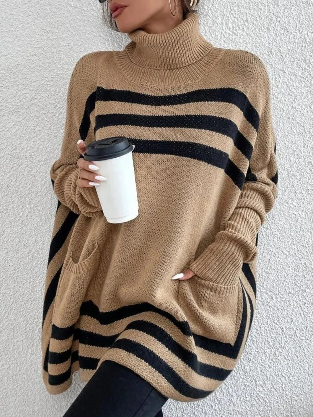 Velste Striped Turtleneck Batwing Sleeve Sweater with Pockets