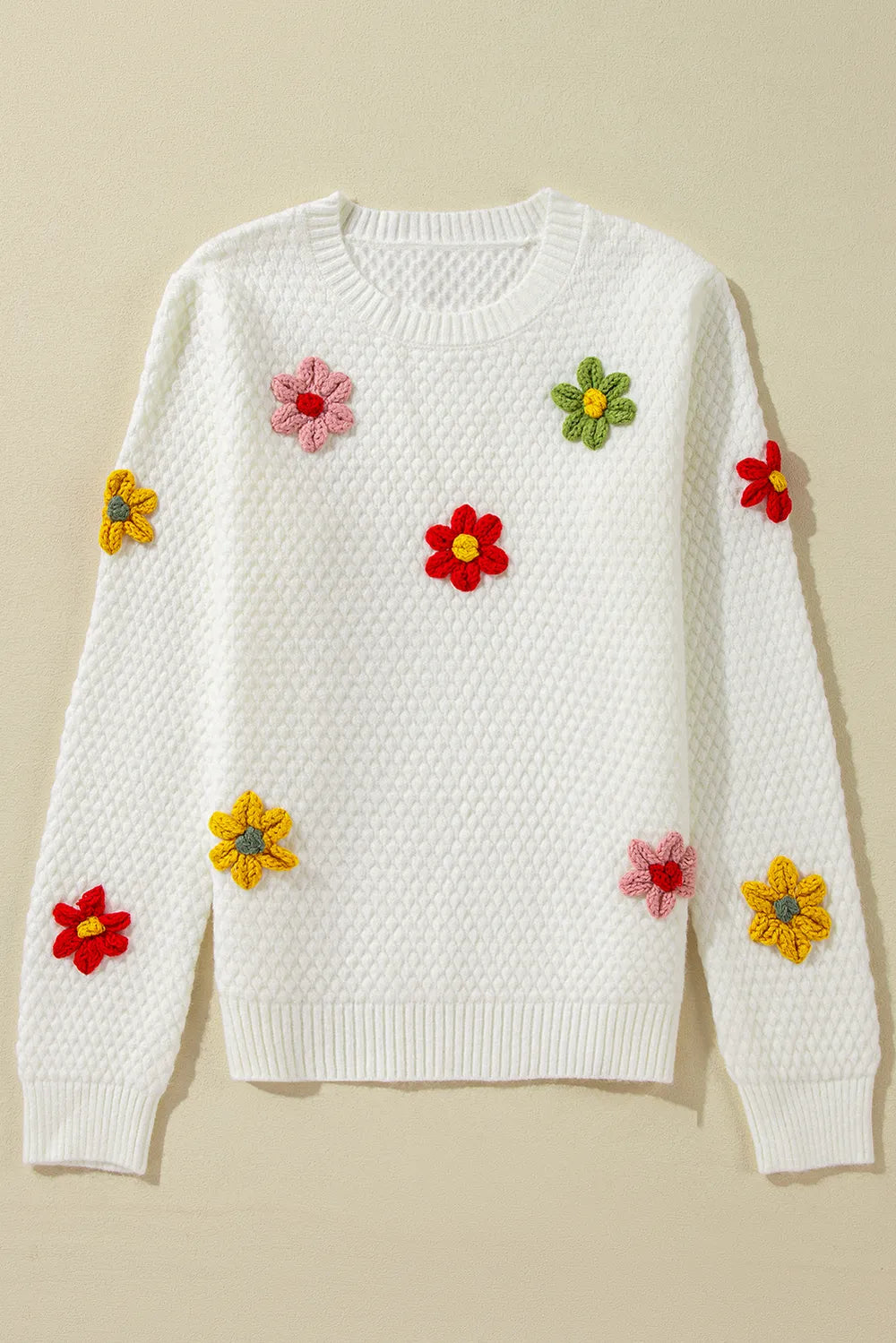 Velste Crochet Flower Round Neck Long Sleeve Sweater