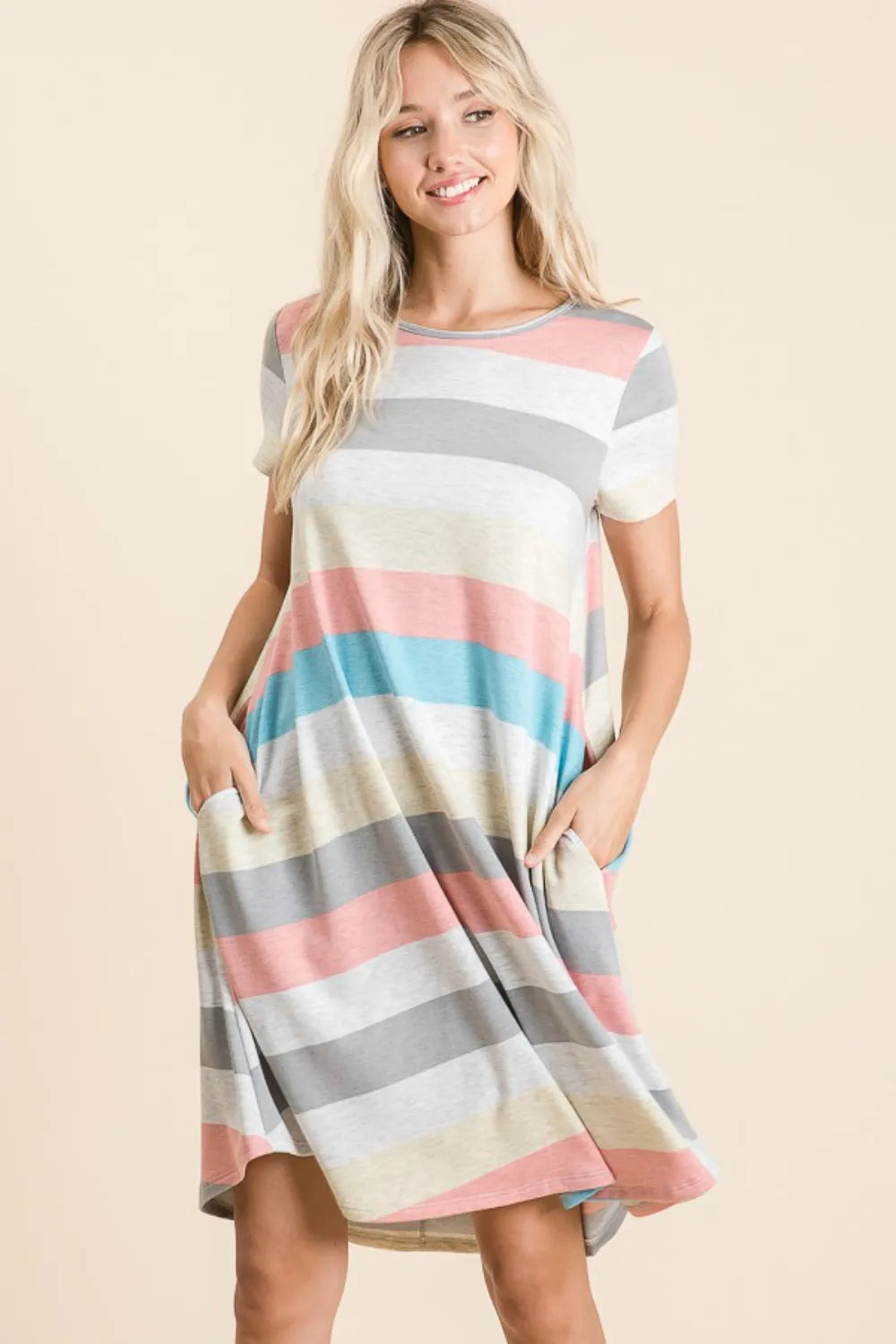BOMBOM Striped Short Sleeve Dress with Pockets