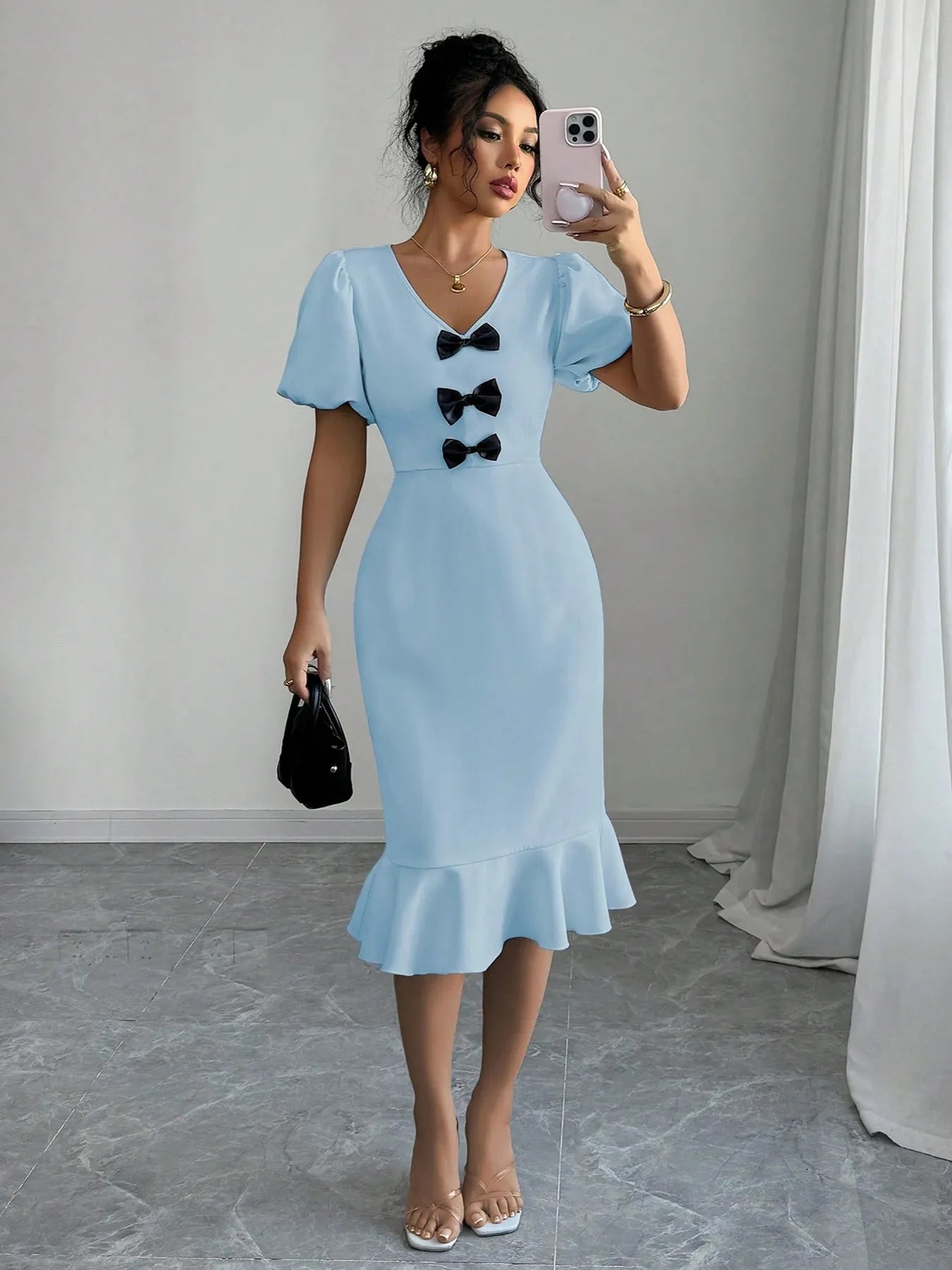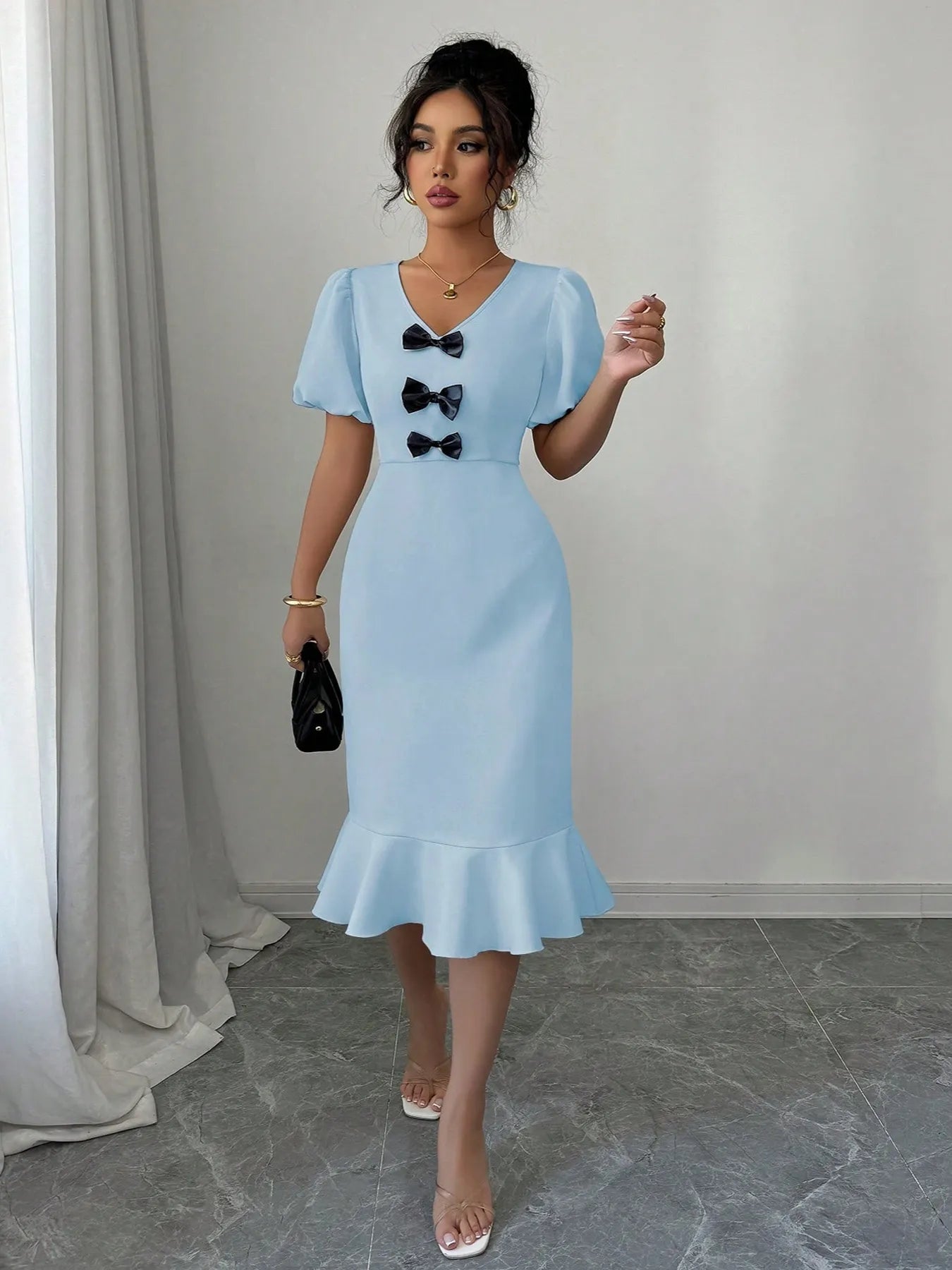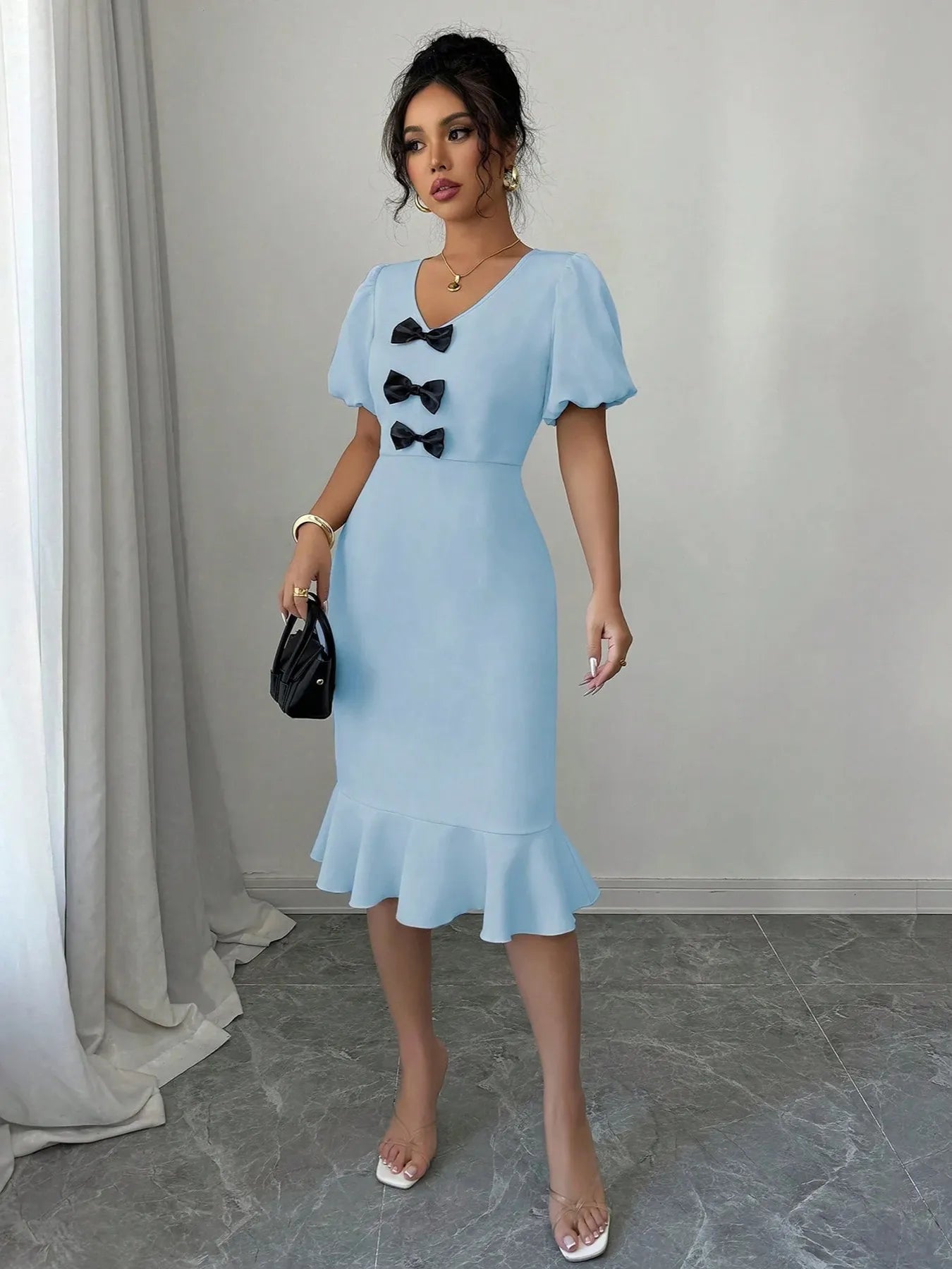 Velste Bow Detail Puff Sleeve Midi Dress