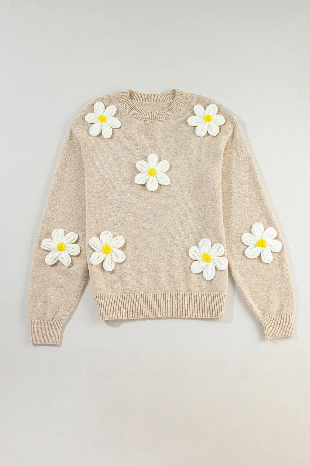 Velste Crochet Flower Round Neck Long Sleeve Sweater