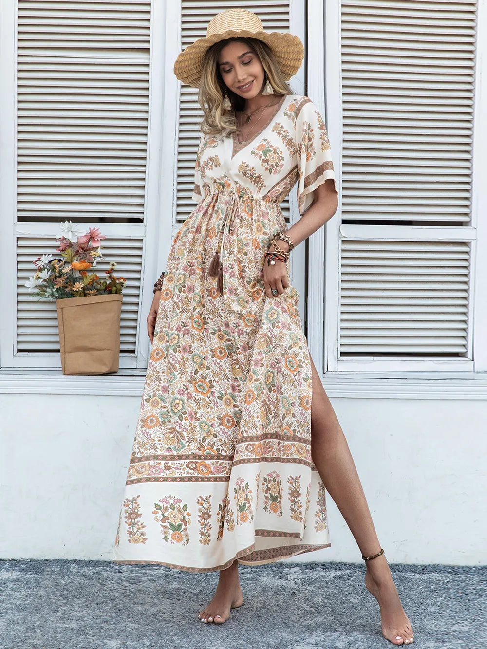 Velste Drawstring Printed Plunge Half Sleeve Dress