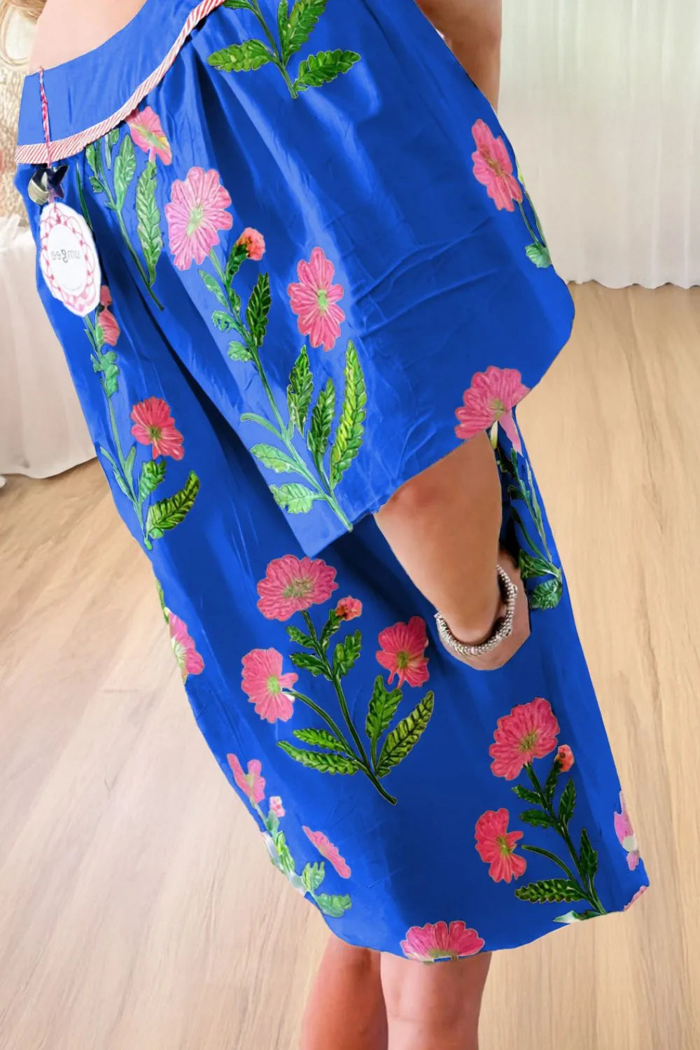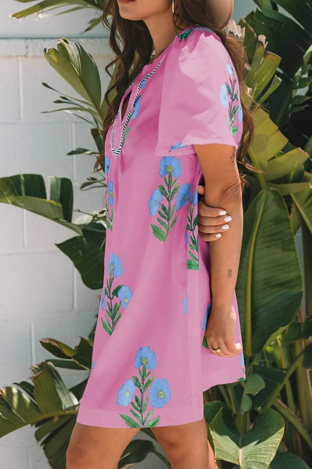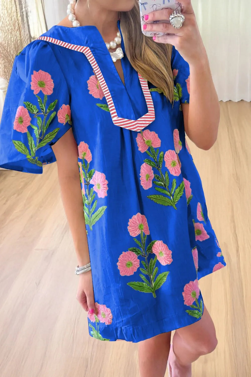 Velste Floral Notched Summer Mini Dress with Striped Trim