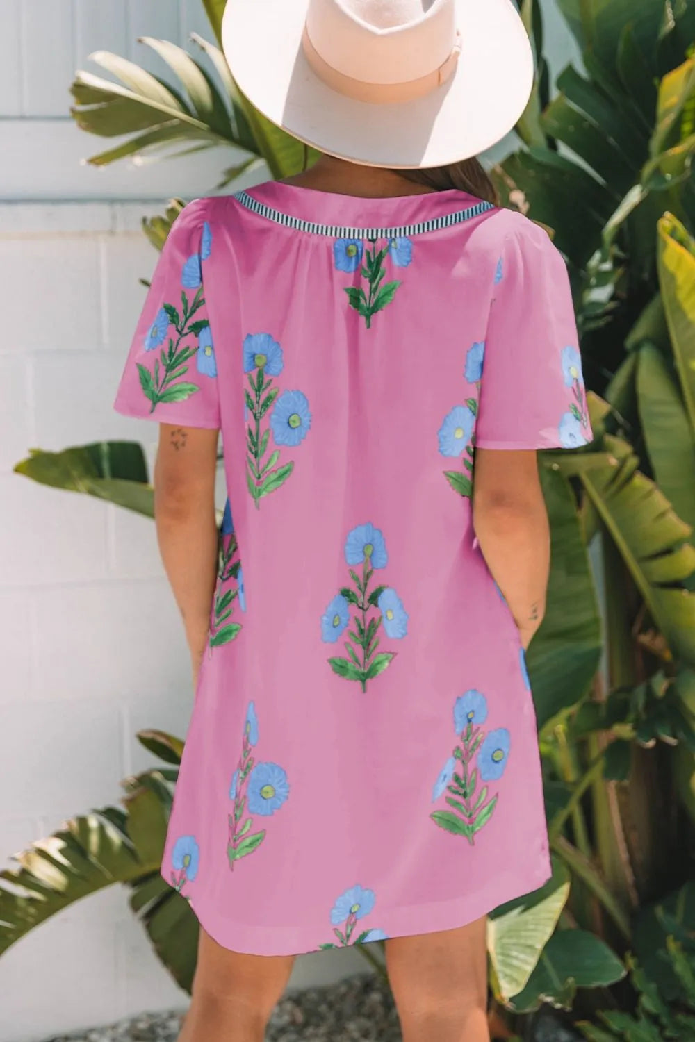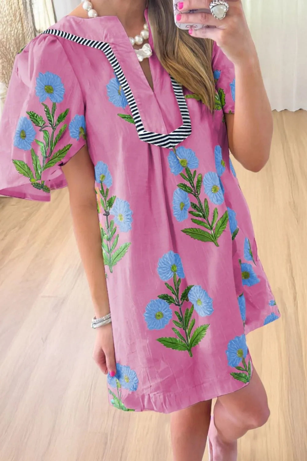 Floral Notched Summer Mini Dress with Striped Trim