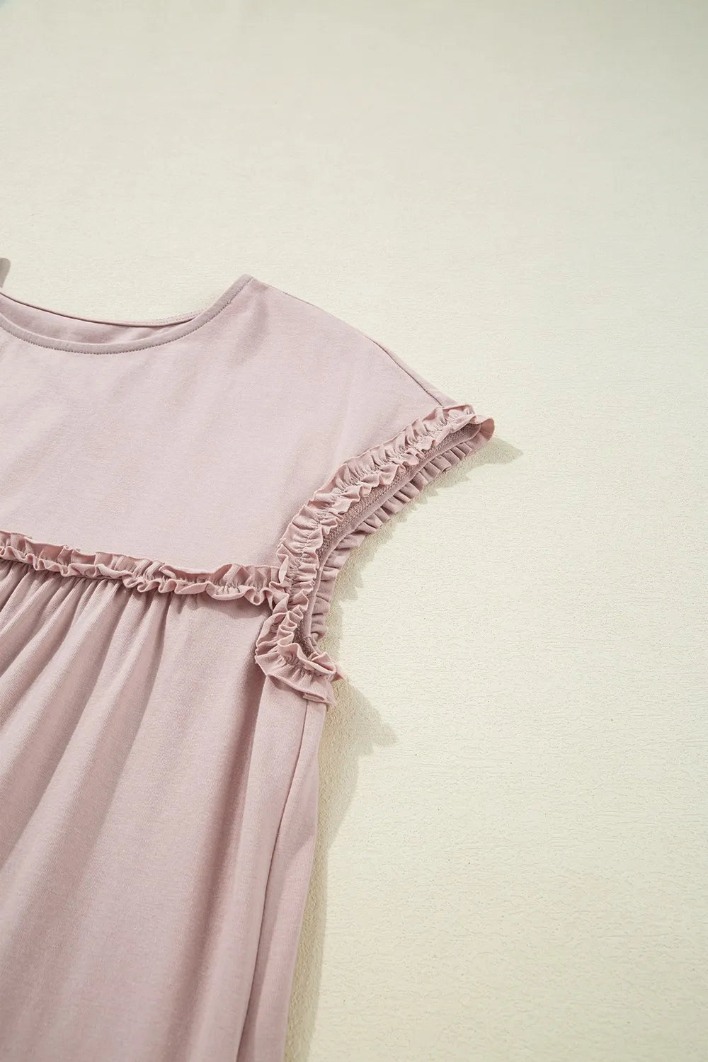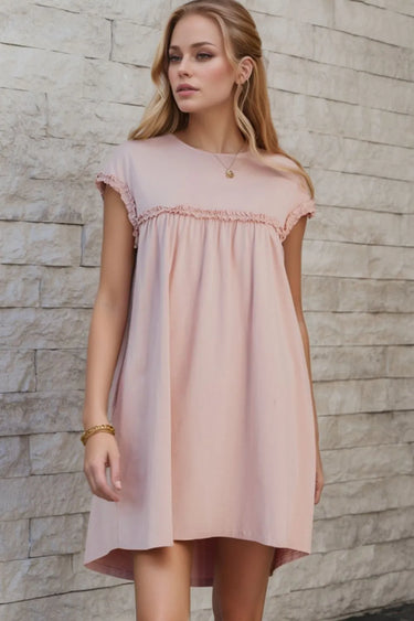 Frilled Trim Crew Neck Cap Sleeve Loose Fit Mini Dress