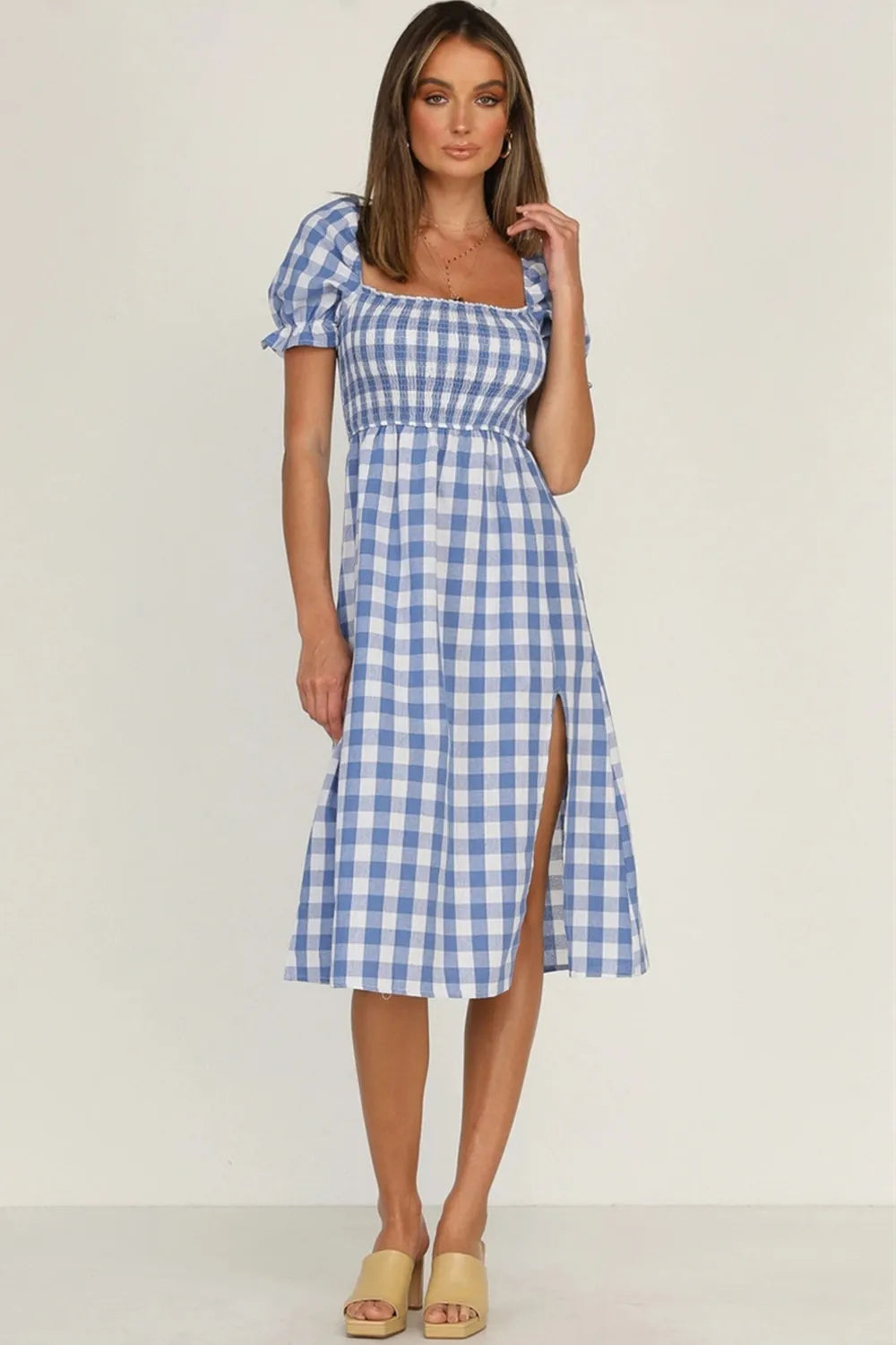 Velste Full Size Slit Plaid Short Sleeve Midi Dress