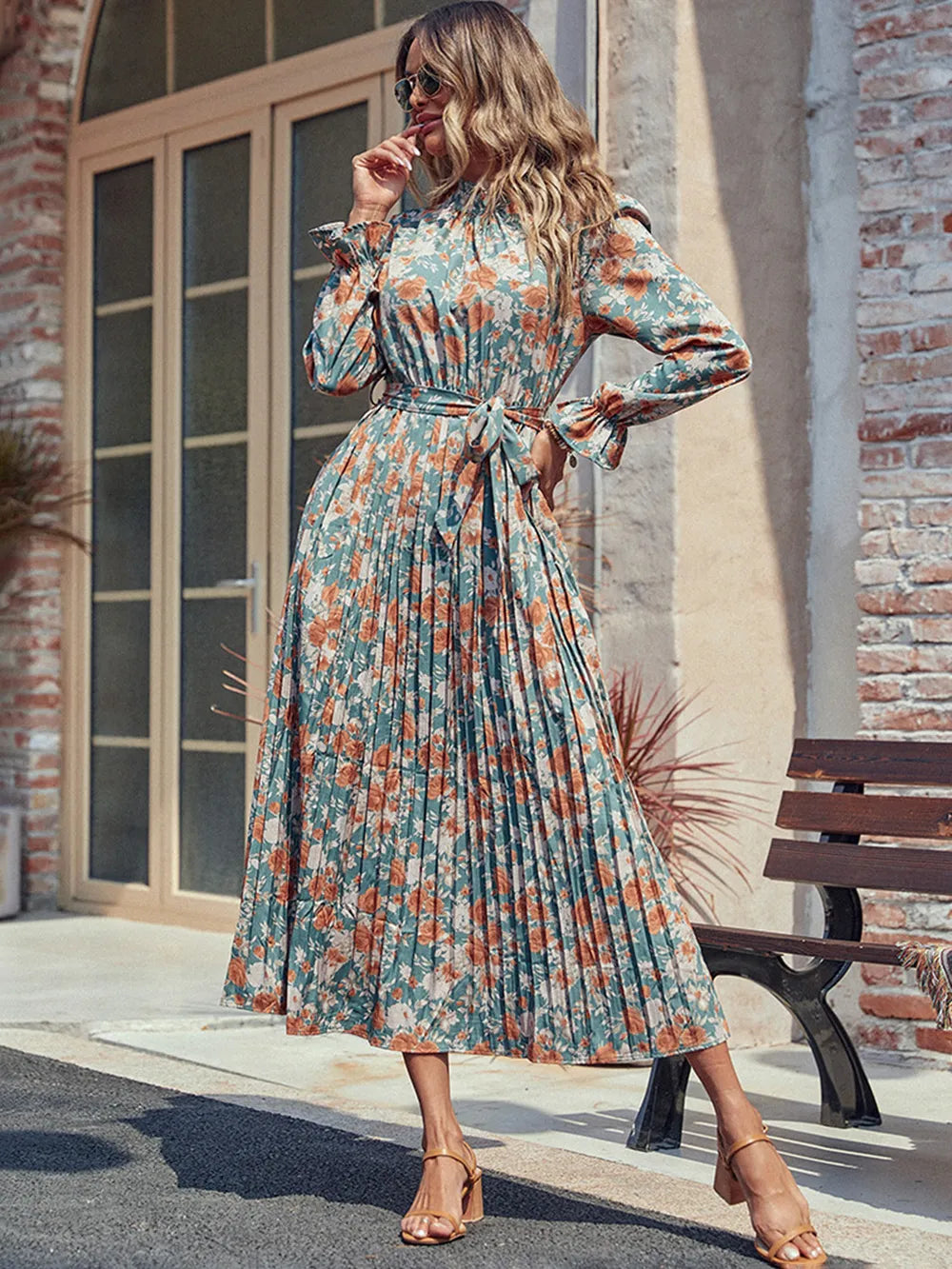 Perfee Tied Pleated Printed Mock Neck Long Sleeve Dress