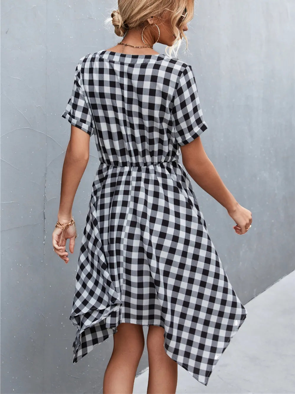 Velste Plaid Notched Short Sleeve Dress
