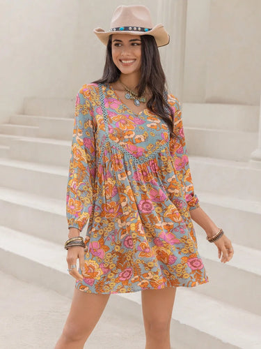 Printed V-Neck Balloon Sleeve Mini Dress