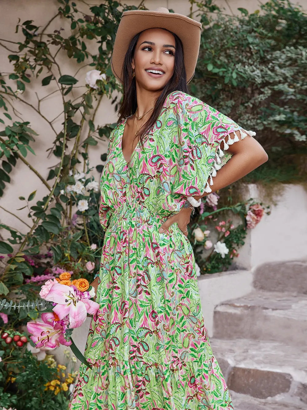 Velste Smocked Floral V-Neck Short Sleeve Dress