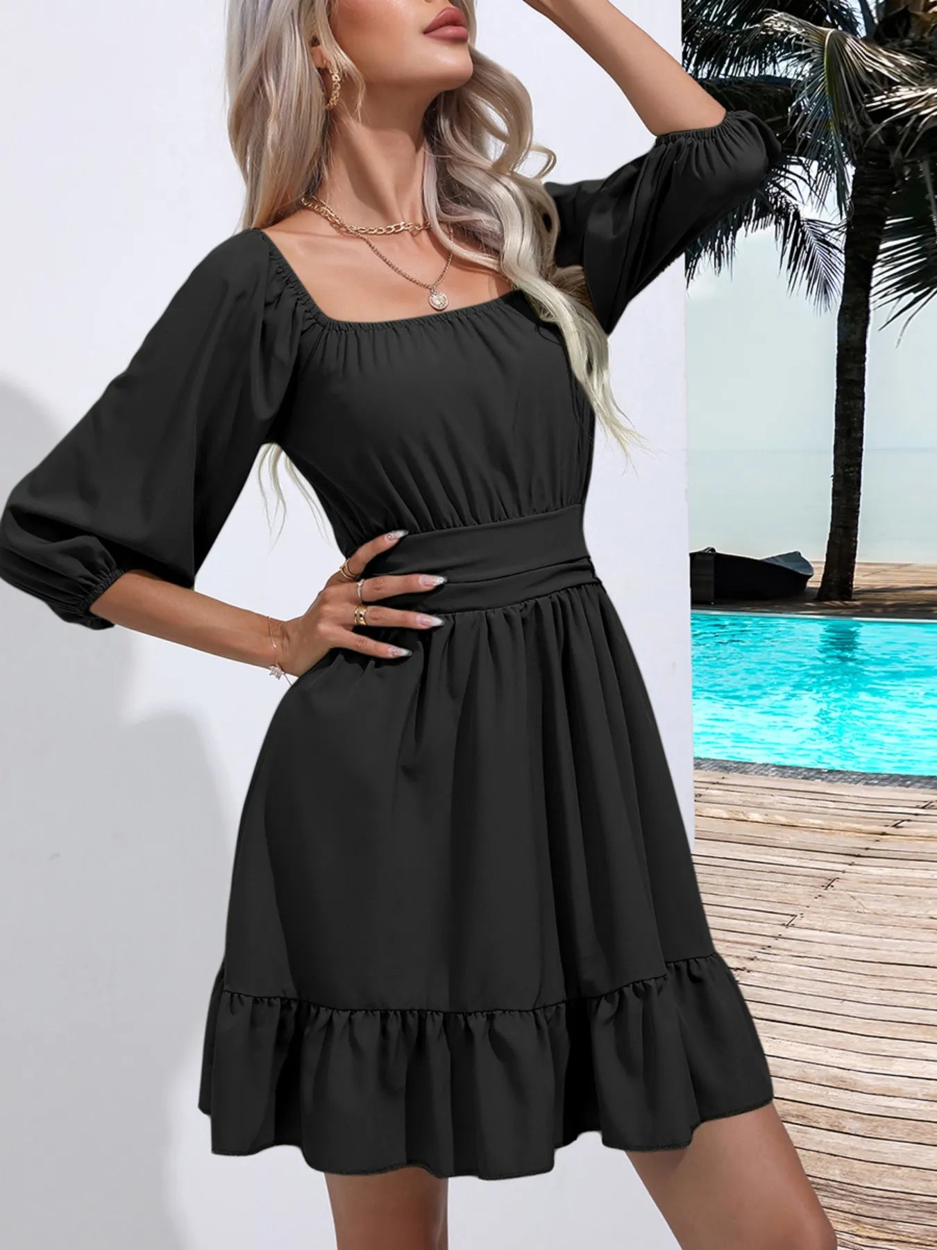 Velste Tie Back Ruffled Hem Square Neck Dress